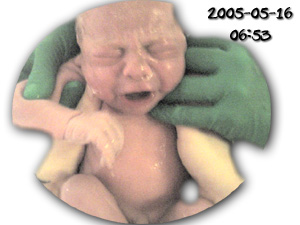 The midwife asked me if I wanted morphine instead. I immidiatly said yes. Wayne remembered me saying earlier that i didn't want morphine so he leaned over to ask me if I was sure. I told him I had to have something, it was hurting so much. The midwife told me she was going to fetch the morphine, and all I could say was "HURRY! Help me!!" She promised to hurry.. but regardless if the actual time she took, it took too long for me. She came back, gave me half a dose of morphine in my left hip (half a shot compared to the 2 i got when having Phini) and increased my nitrous.. Shortly thereafter, I looked at Wayne, groggy as I was, and mumbled "the morphine is kicking in.... the morphine is kicking in...." The rest is a blurry faded memory to me. I could still feel the contractions and I held on to the nitrous as if it was the only thing keeping me alive. I remember the midwife taking the mask away from me all of a sudden and told me to press my chin to my chest and push. What the hell?! Where's the mask!? THE MASK! THE MASK! THE MASK! NITROUS!! I didn't have much choice than to push, I could feel the pressure so I pushed for all I was worth. 3 pushes later and he was out, o6:53, may 16th of 'o5. The midwife held him up and Wayne took a photo of him. Then he was put on my chest and he stayed there for quite some time while I pushed out the placenta and while i got stitched up. The midwife then grabbed him quickly to weigh him and messure him - 2950 grams and 50 cm. He was a little bigger than we thought he'd be! We were served coffee, cider and sandwiches on a tray with the swedish flag on it. The coffee was most appealing to us at the time. Around 10am I was up, dressed and dancing to the radio, pumped with adrenalin and pure joy. I was feeling great! At around 11am we went to the patient-hotel and got checked in and shortly thereafter Wayne went home to Phini, completely exhausted as he had not slept at all the night before. It felt safe to know that he went home to b e with our sick little toddler at home. Laaiti and I rested that day, took it easy. We tried our best to get the nursing to work, and just enjoyed each other, being together and finally meeting each other. The day after (tue 17/5) we went home, around lunch-time. |
